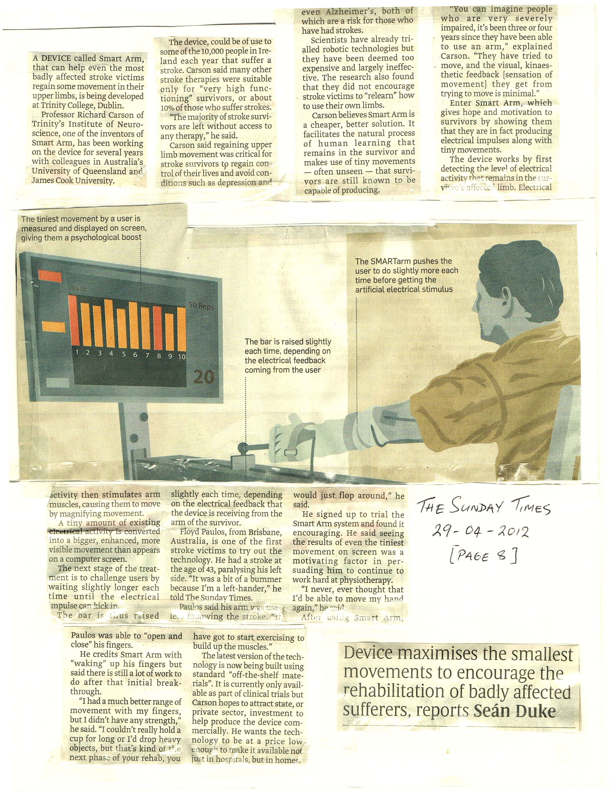 SMART Arm, a device invented by Richard Carson, Professor at the Institute of Neuroscience at TCD, and colleagues in Australia, takes the small remaining movement left in the damaged arm of even the most severely affected stroke survivors and enhances that movement electrically. This opens up the possibility of rehab for all stroke survivors.
