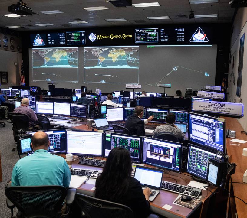Date: 06-06-19 Location: Bldg 30 W-FCR & Sops Suite 1 Subject: Orion EM-1 Flight Control Team Simulation - Execution of Outbound Trajectory Correction – 2 (OTC-2) burn. Post TLI Orion will perform a series (6) OTCs that will lead up to the Outbound Powered Flyby (OPF) burn as Orion swings past the moon. The OTCs adjust Orion’s trajectory to ensure that OPF occurs at the correct place and time. Flight Director Rick LaBrode. Photographer: James Blair